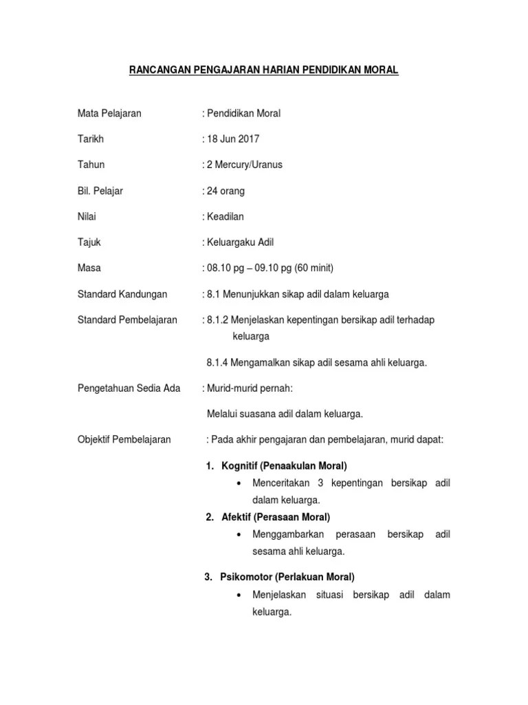 Memberi tumpuan terhadap kesemua mata pelajaran di kelas. Keadilan (kepentingan bersikap adil terhadap keluarga) selamat mencuba! Rancangan pengajaran harian pendidikan moral tahun 3 tarikh masa kelas nilai utama. Murid mendengar guru membuat tentang isi pelajaran.